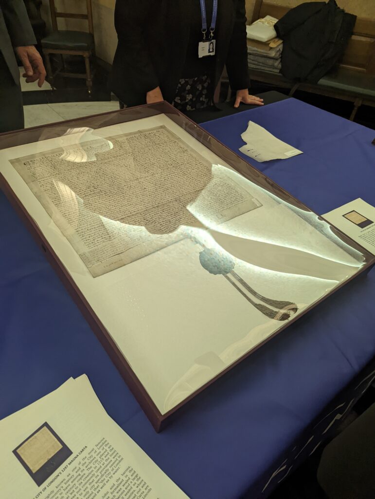 The keynote address and panel were bracketed by a kind of legal freshers fair, stalls abounded; there were groups of professional bodies, RAND, RBIJ, Serco – all commercial sponsors of the event; there were official representatives of criminal justice and the City of London – the Met, and the Sheriff and Recorder’s Fund, and the Old Bailey’s merchandise; the crown of all these stalls, and the one amassing the biggest crowd, was the London Archive’s display of the 1297 copy of Magna Carta – a beautiful, inscrutable, document at the heart of this and every legal event.