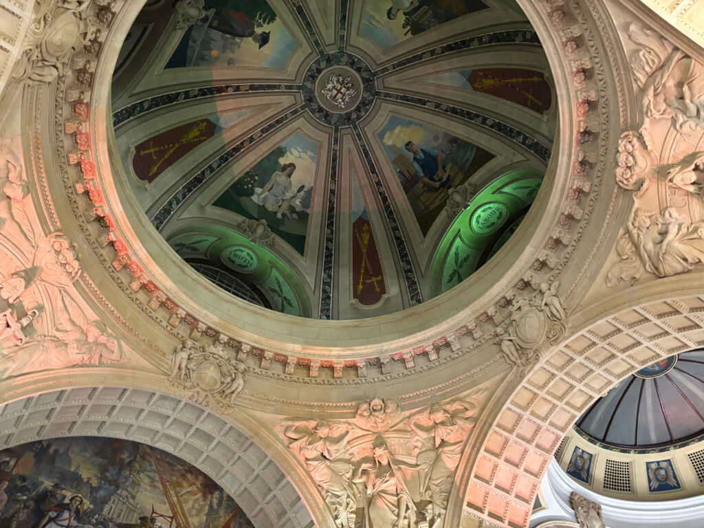 Upon entry, a soaring staircase ascends to a grand chamber of Sicilian marble, crowned by a dome ceiling adorned with allegorical sculptures depicting Charity, Mercy, Temperance, and Justice. Built on the site of Newgate Prison, the Old Bailey embodied the sweeping reforms to the criminal justice system at the turn of the century. At its opening in 1907, Edward VII spoke of replacing the “barbarous legal code” of the nineteenth century with a system marked by the “mercy shown to first offenders which is…often the means of reshaping their lives.”