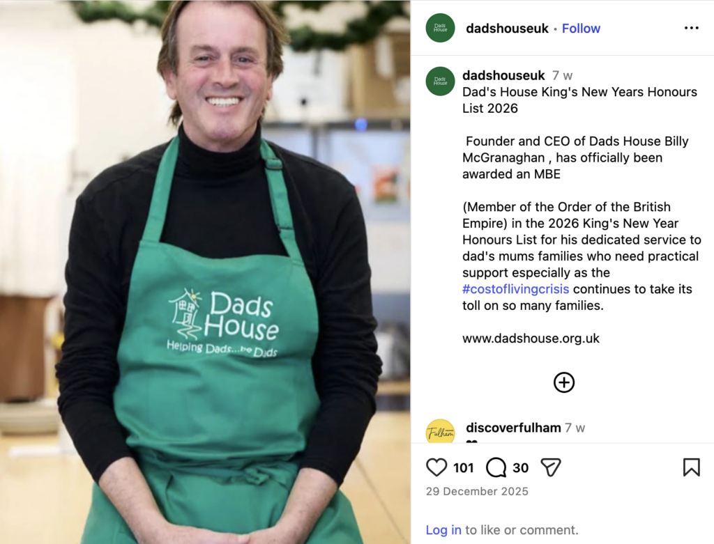 The physical space reflects the philosophy and practice of Dad’s House perfectly. Founded in 2008 by Billy McGranaghan, himself a single father who noticed an acute lack of support for other struggling dads, the organisation’s original purpose was to aid single dads with the practicalities of raising their children alone. A suite of related services followed, such as the food bank, support group, guitar lessons, and five-a-side football team. The family law clinic arrived in 2020. None of these parts feel at all segmented from each other, no doubt because they are all united in the founding mission of the place, and thanks to the binding glue that is Billy. He possesses an unmatched affability which makes every visitor (including this one) feel instantly welcome. It’s not for nothing that he was awarded an MBEin the King’s New Year Honours List 2026, for his contribution to fathers and families and leadership in establishing Dad’s House.