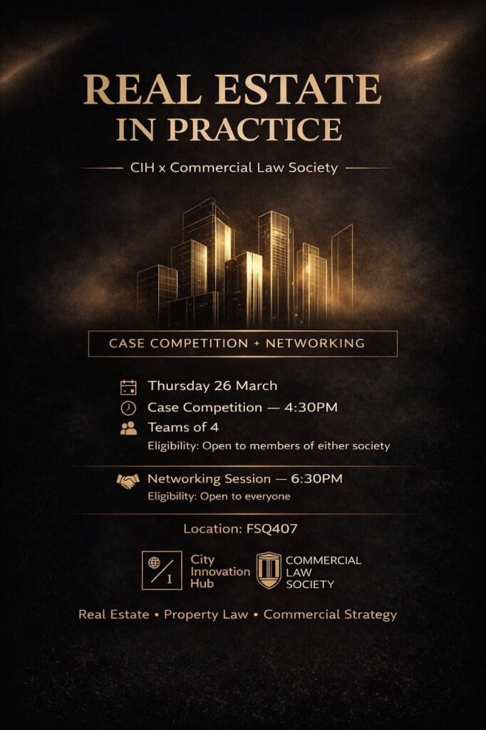 Additionally, the society is also collaborating with the City Innovation Hub from Bayes Business School on a case competition and networking event focused on “Real Estate in Practice”. This will take place on the 26th of March 2026, bringing together students and professionals who work in the industry, to network together in an informal setting with firms such as Moore Barlow in attendance.
