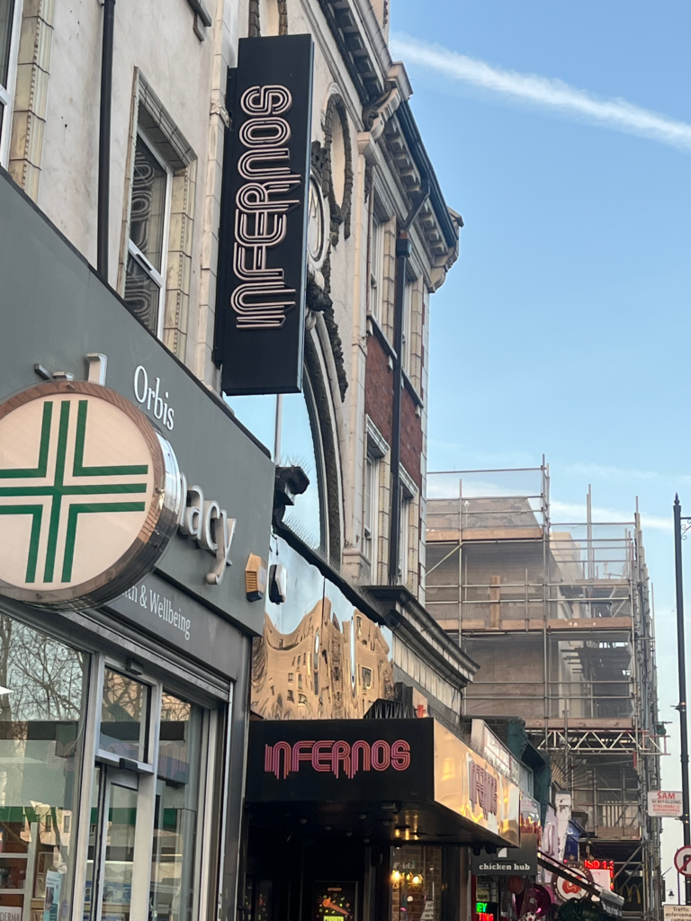 I’ll lighten the tone for the final stop in this legal walking tour of Clapham. If you continue on from the bandstand and on towards Clapham High Street, passing between Clapham Common Station and Clapham North station, you will pass a small building, tucked between a pharmacy and chicken shop. This small front is deceptive: once inside the hallowed halls of the nightclub Infernos, the place expands into a seemingly incomprehensibly large temple of late-night iniquities. For my sins, I have paid the rather eye-watering entry fee and seen it for myself. It’s immaterial for this article whether or you consider the place to be one of Southwest London’s finest cultural contributions or find its Dante-esque naming to be unfortunately revealingly.
